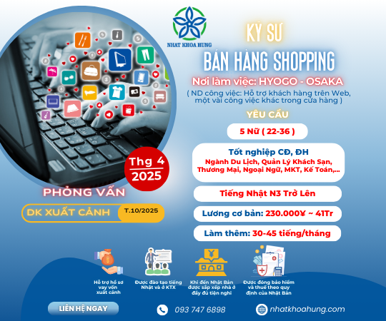 [HYOGO - OSAKA] TUYỂN 5 NỮ BÁN HÀNG SHOPPING, CÔNG VIỆC NHẸ NHÀNG -MÔI TRƯỜNG CHUYÊN NGHIỆP